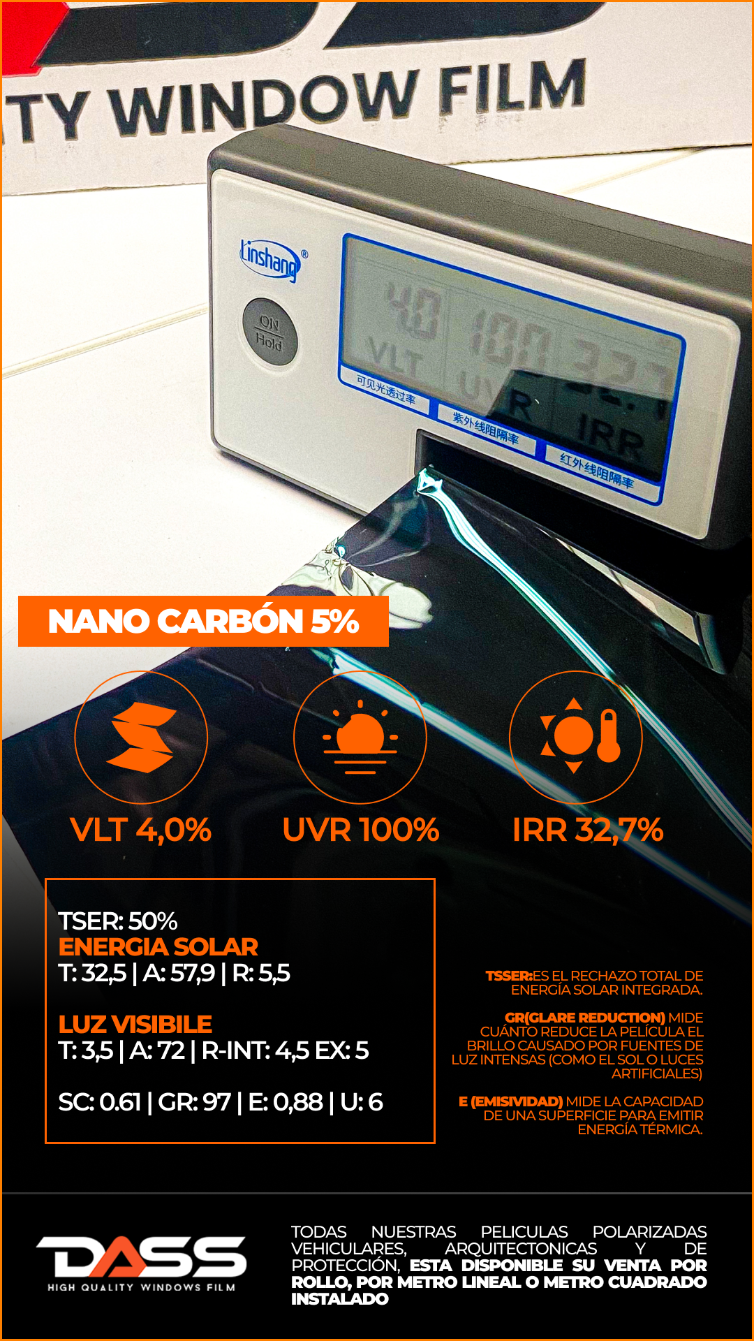 La película polarizada Nano Carbono 5% DASS está diseñada para quienes buscan un tono profundamente oscuro, cercano al negro intenso, con excelente nitidez y desempeño en control solar.